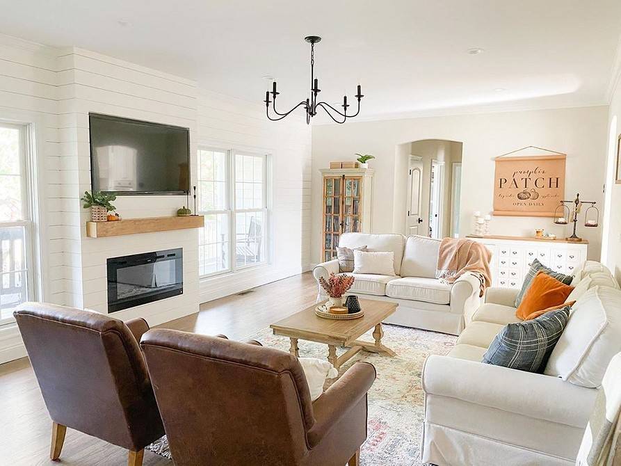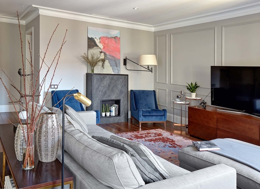 Камин под телевизором в гостиной (взгляните на фото ниже) часто помогает четче обозначить смысловой центр комнаты, привлекает внимание к лаунж-пространству — и при этом делает «черный экран» менее заметным. Кроме того, такой вариант — отличный выбор для небольших комнат, где чрезмерное дробление на зоны попросту бессмысленно