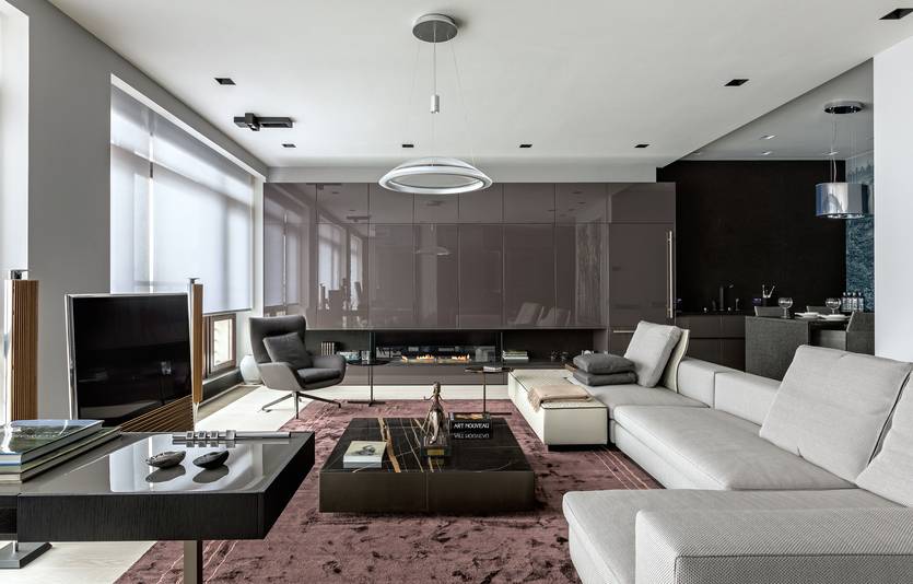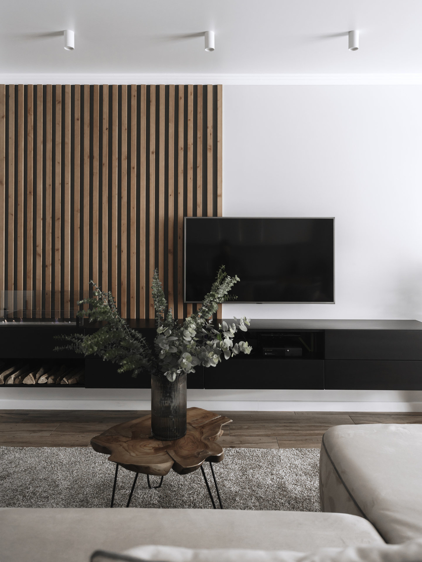 Если телезона и каминный портал не располагаются вместе, но при этом доминирующая функция в гостиной всего одна, — чаще всего смысловым центром становится телевизор. Камин при этом может или играть только декоративную роль, или служить также функциональным элементом (например, помогать в зонировании).
