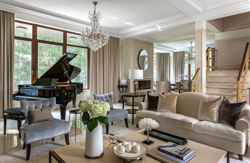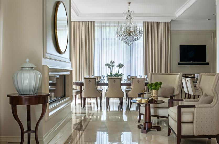 Весь декоративный потенциал таких стилевых направления можно раскрыть только на большой площади. Как вам такой дизайн интерьера кухни гостиной в классическом стиле?