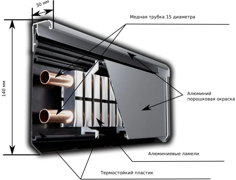 - Внутри короба располагаются нагревательные элементы (электрические нагреватели или трубы контура водяного теплоснабжения) с развитой поверхностью теплообмена. Последнее, как правило, достигается за счет установки на трубы нагревательного элемента множества пластин из материала, обладающего высокой теплопроводностью (чаще всего, меди или латуни, реже – алюминия).