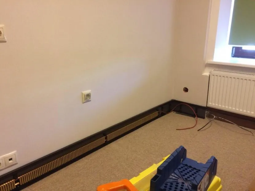- Особенность монтажа водяного греющего плинтуса заключается в том, что его можно проводить только во время ремонта, так как трубы приходится прятать в пол. На трубах экономить нельзя: после укладки в стяжку они станут недоступными для обслуживания. Качественные трубы надо искать у известных производителей, но ценник будет ощутимо выше.