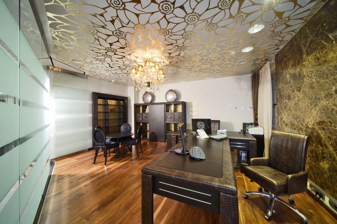 Полет дизайнерской фантазии зачастую обрывается в связи с невозможностью украсить интерьер в задуманном русле. Предположим, как в обычной городской квартире облицевать потолок мрамором или декорировать шелком? Оказывается, есть такая возможность, если воспользоваться материалами, имитирующими камень или ткань. Излюбленные варианты дизайнеров – разнообразные фактурные натяжные потолки, эффектно повторяющие природную структуру или рисунок. Вместо натяжного полотна можно использовать штукатурку или даже краску.