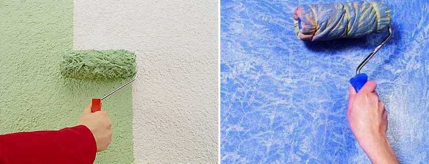 - То же самое можно сказать и о валиках. Обычным меховым валиком грунтуют поверхности. Существует технология нанесения таким валиком фактурной штукатурки. Узорным валиком можно наносить рисунок даже на простую штукатурку, а не только на декоративную.