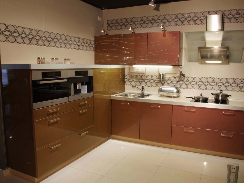 Особое внимание уделяют зоне приготовления пищи, под вытяжкой. Дополнением может служить панно или полоски с растительным или рельефным орнаментом, геометрическими строгими или объемными рисунками, узор из плитки другого цвета. Очень хорошо вписывается кладка «в разбежку» из «кабанчика», напоминающая кирпичную кладку