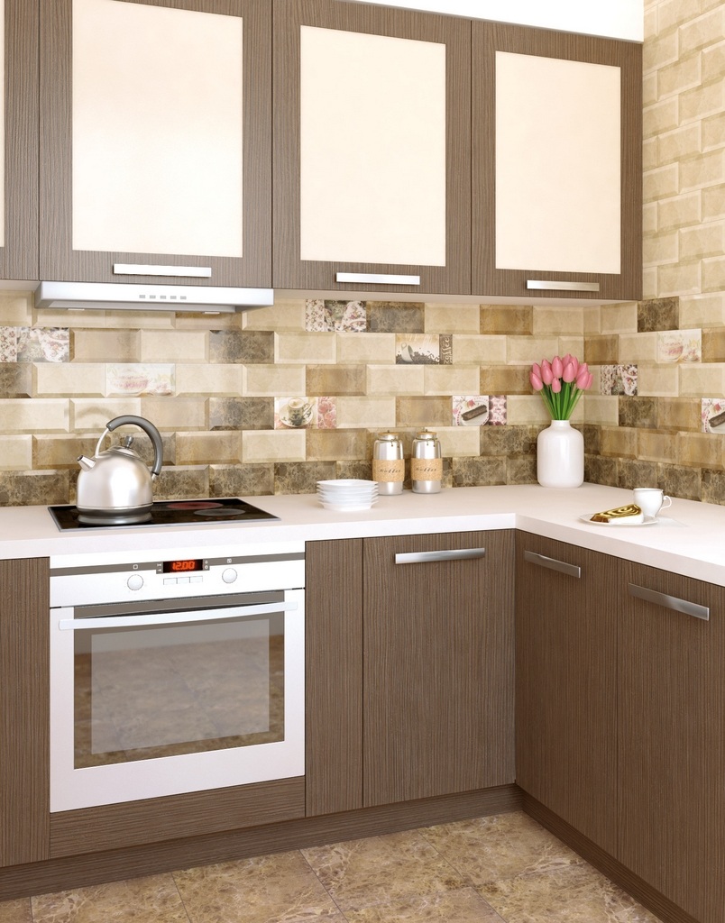 Чтобы упростить оформление кухонного фартука, применяют имитацию мелкой плитки 10 на 10. Из-за наличия разделений она выглядит аналогично, но при этом поверхность кладки имеет меньше швов. Продаются элементы размера 20 на 20, 20 на 30, 30 на 30 и более. Чем больше, тем быстрей и проще укладывать.
