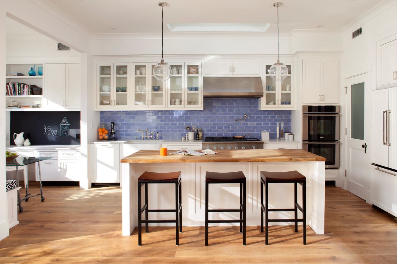 Для светлой кухни классическим решением будет облицовывание фартука белой плиткой «кабанчик». Очевидный минус: особый уход за белой затиркой. Иногда эту проблему решают подборкой затирки более темного цвета, создавая контраст.