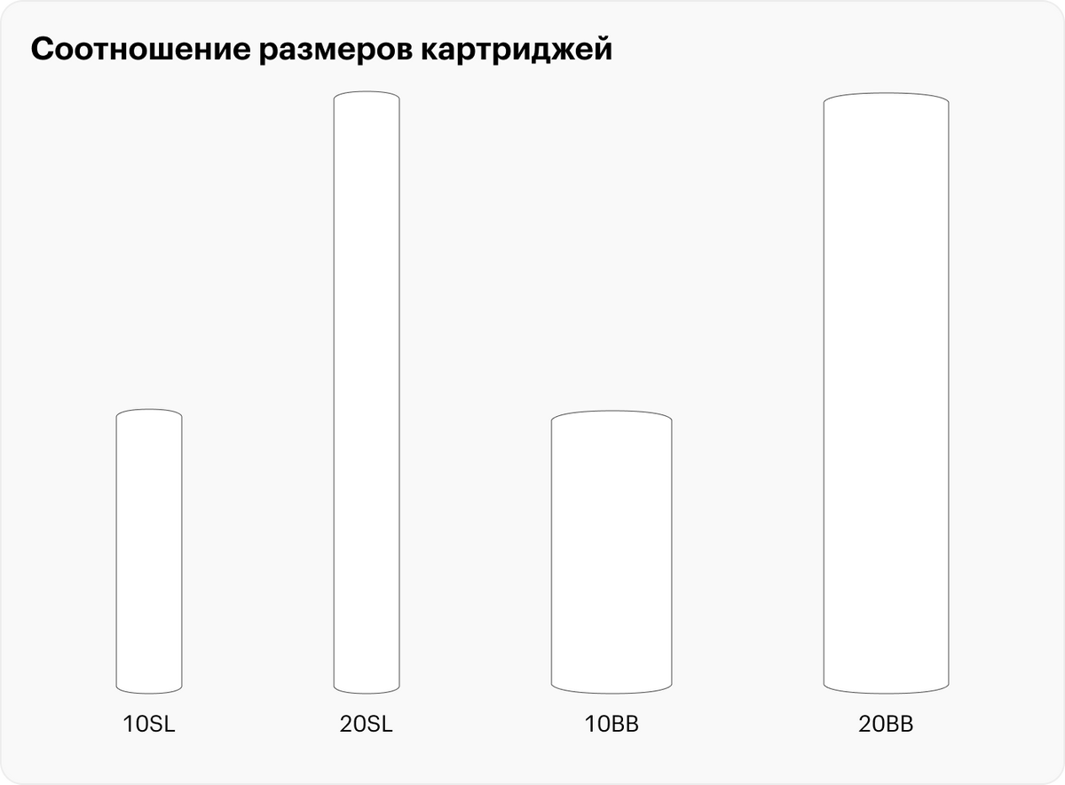 По размеру картриджи для проточных фильтров бывают разной ширины и высоты: узкие — 10SL, 20SL, широкие — 10BB, 20BB. Пропускная способность тонких картриджей ниже: за час механический фильтр из полистирола очищает 900 л воды, а блок ВВ — 1800 л. Но и того и другого достаточно для квартиры.