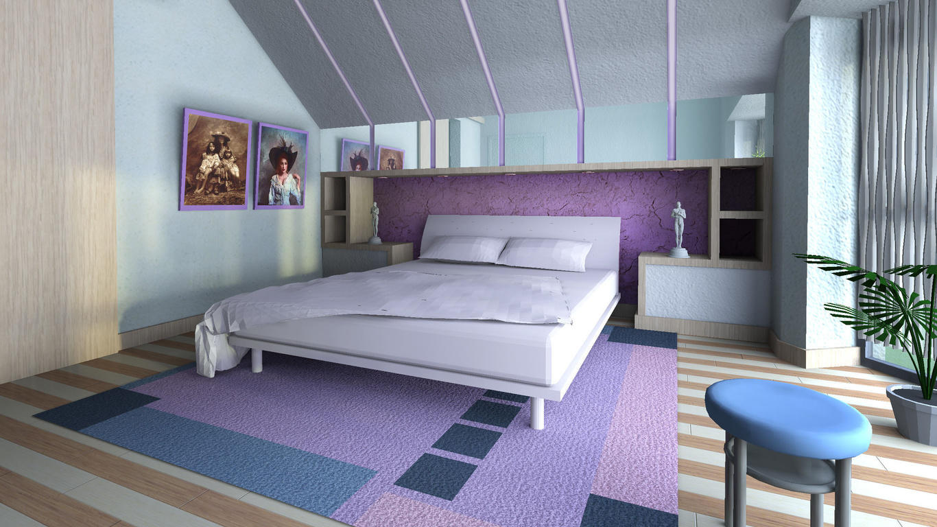 Если фиолетовый цвет дополнить бледно-розовым, светло-синим или сдержанным голубым, получится комната, выполненная в монохромных тонах