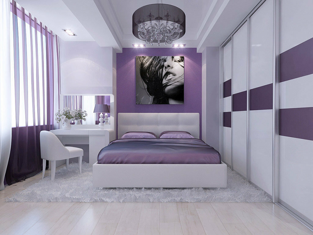 При создании контрастного яркого дизайна нельзя забывать одно главное правило: предметов и ярких красок не должно быть много. Чересчур пестрая спальная комната потеряет свою главную функцию: в ней невозможно будет полностью расслабиться, отдохнуть и хорошо выспаться. Разобраться в тонкостях подбора цветного текстиля и мебели помогут фото спален в фиолетовом цвете.