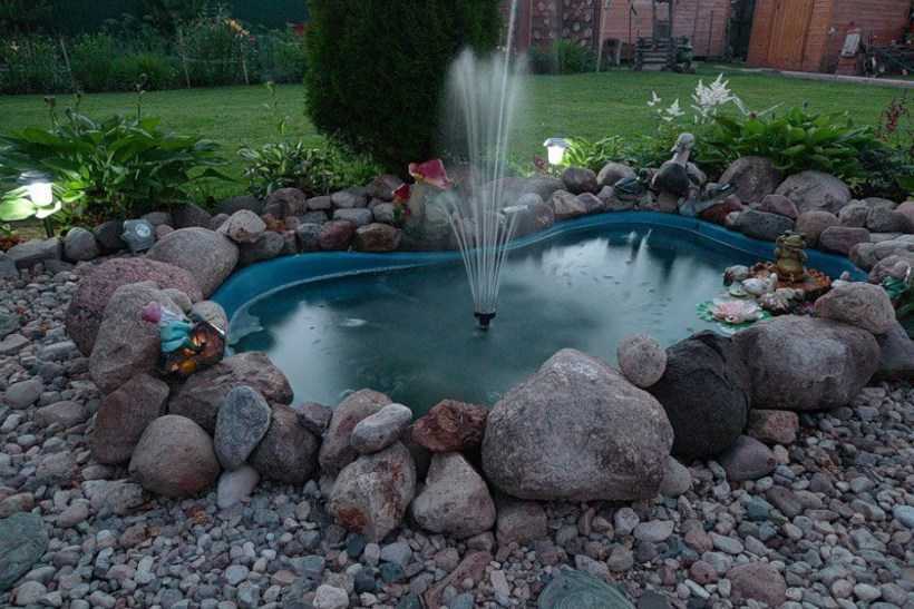 Насос и трубки обычно обкладывают камнями, а фонтан украшают различным декором и растениями. Опционально добавляют встроенную подсветку или несколько светильников вокруг.