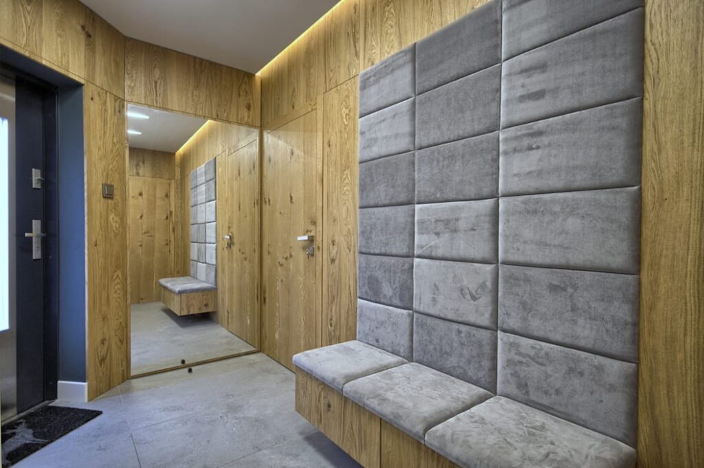 Материалы и фактура имеют большое значение при оформлении элегантной прихожей. Отделка деревом придаст помещению уют, а глянцевый натяжной потолок — простор.