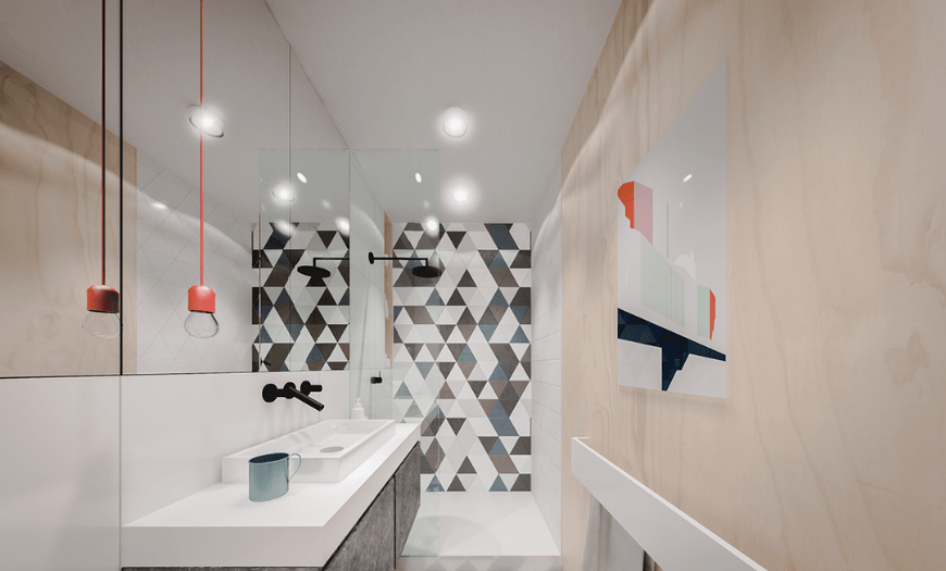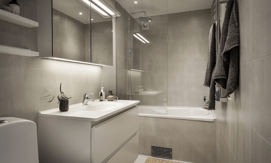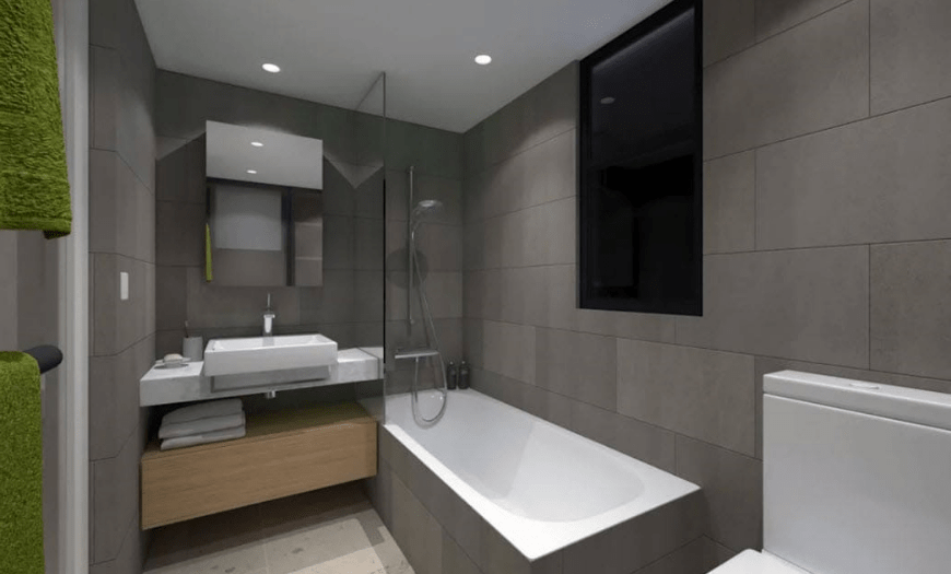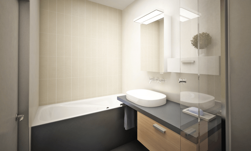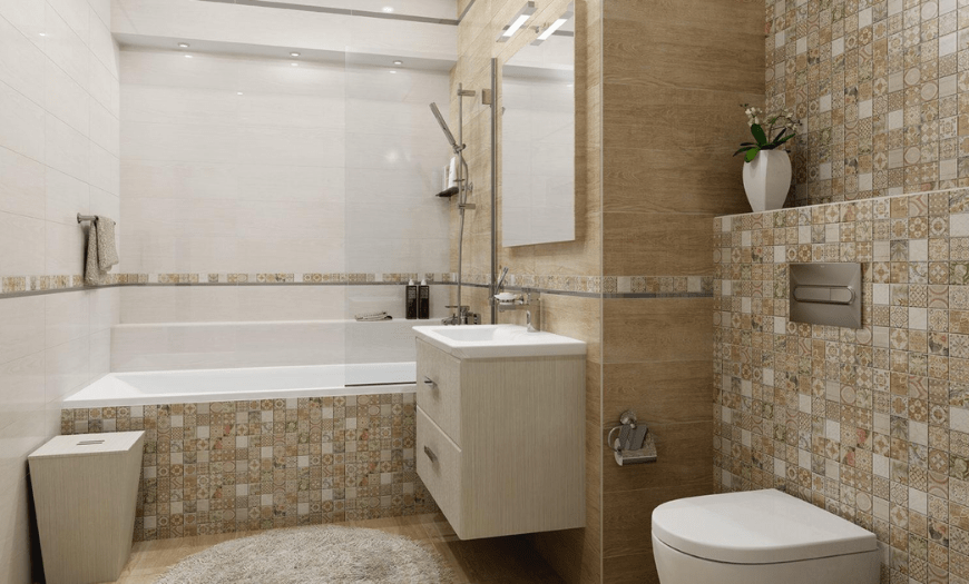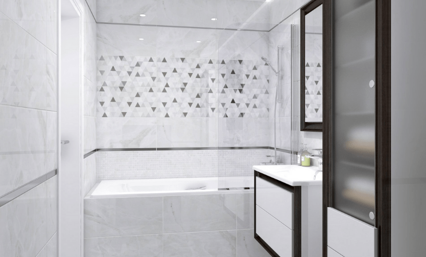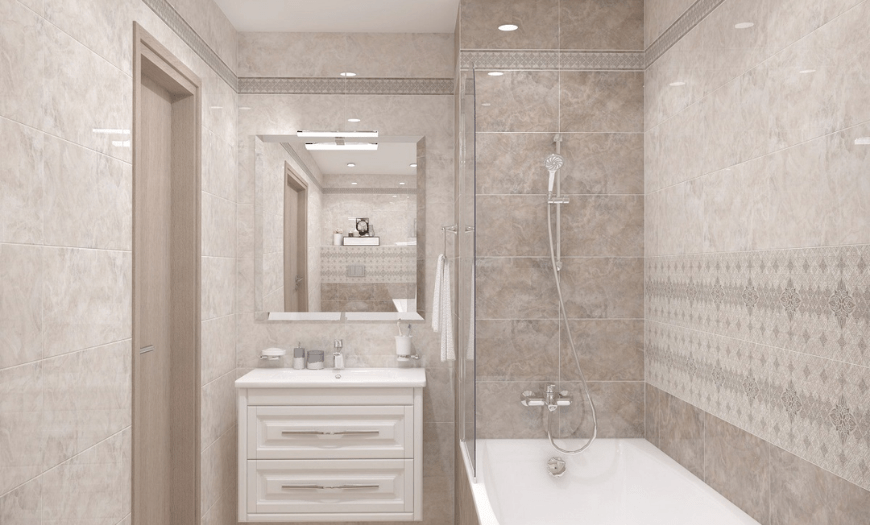 С помощью стеклянных потолков помещение ванной будет «дышать». В интерьер можно добавить немного легкости путем установки стеклянной прозрачной раковины. Также можно сэкономить площадь, спрятав раковину в проем, при необходимости выдвигая ее. Предметы интерьера должны быть в одной гамме цветов со стенами, чтобы создавалось единство стиля. Высота помещения может быть увеличена с помощью плитки с вертикальным орнаментом. Также комната будет визуально вытянутой с добавлением фриза, который разделяет плитку в центре. Плиточный орнамент не должен быть утяжеленным и мелким.