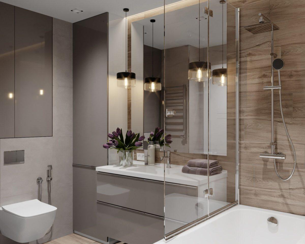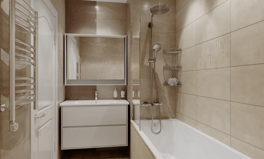 Визуально сделает помещение больше, чем оно является на самом деле, использование зеркал и прозрачных стеклянных элементов. Зеркало можно повесить на одну из стен или украсить им дверцу шкафа с ванными принадлежностями — таким образом удастся убрать эффект нагромождения и увеличить площадь комнаты.