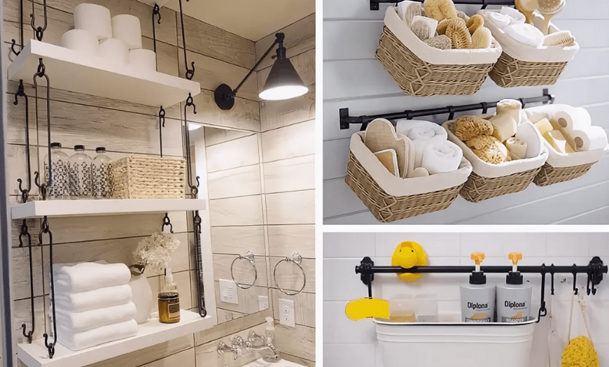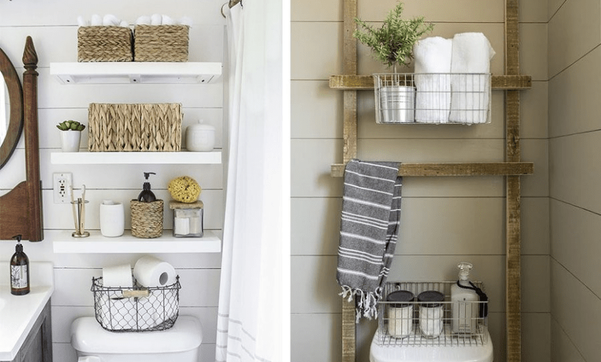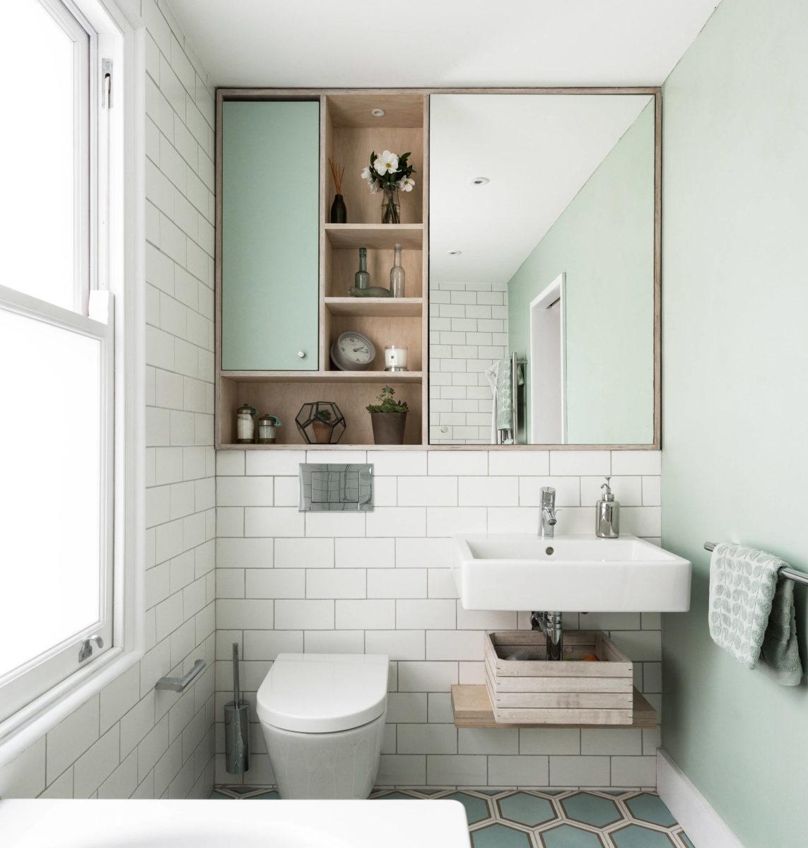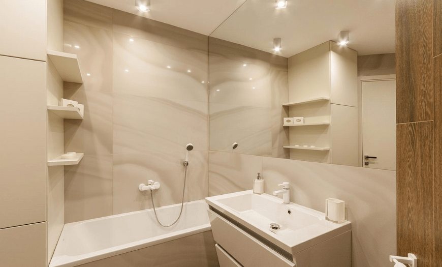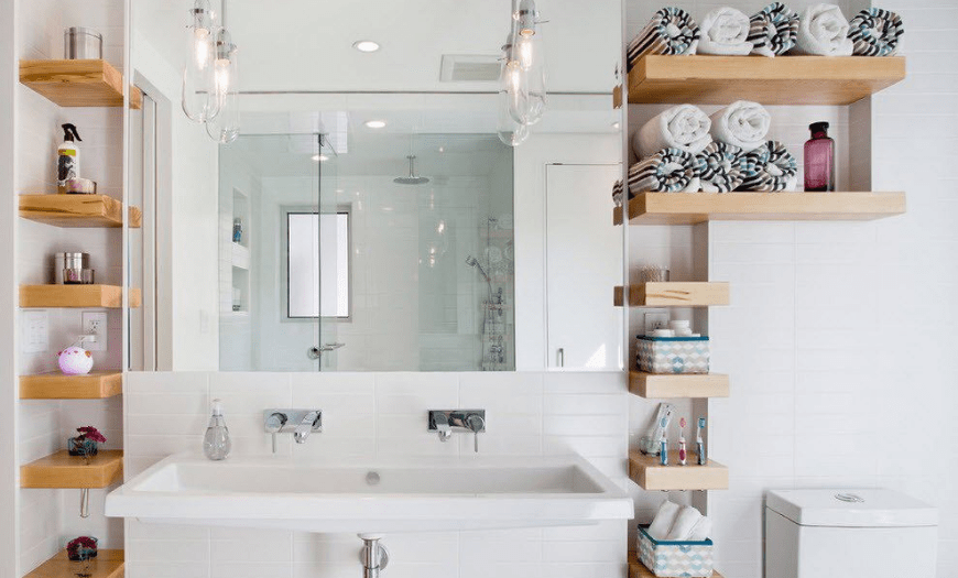 В небольшом помещении напольные и навесные шкафы лучше заменить встроенной мебелью или сделать цельным полотном полки, которые будут полностью закрывать стену. Сначала можно подумать, что наличие встроенной мебели может уменьшать пространство, но в действительности ощущение тесноты проявляется из-за отдельно расположенных предметов. Сплошные полки или встроенная мебель восприниматься как комплексный ансамбль, что будет визуально расширять пространство. Также следует размещать все предметы в шкафу, насколько это возможно. Чем больше аксессуаров и предметов будет оставаться не спрятанными, тем будет теснее казаться ванная комната.