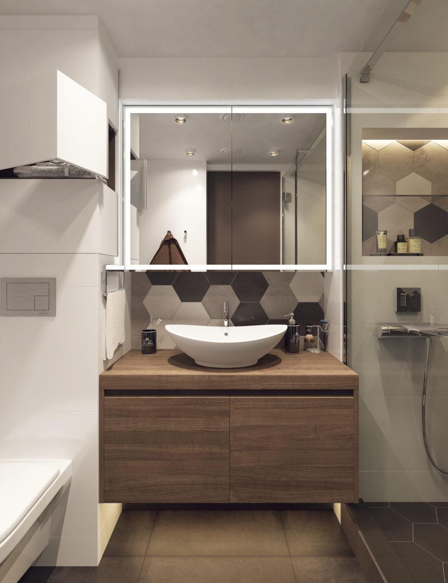 Подобную конструкцию проще вписать в интерьер. Если для облицовки использовать одинаковый кафель, стеклянные дверцы и перегородки, то это создаст эффект лёгкости, разгрузит пространство.