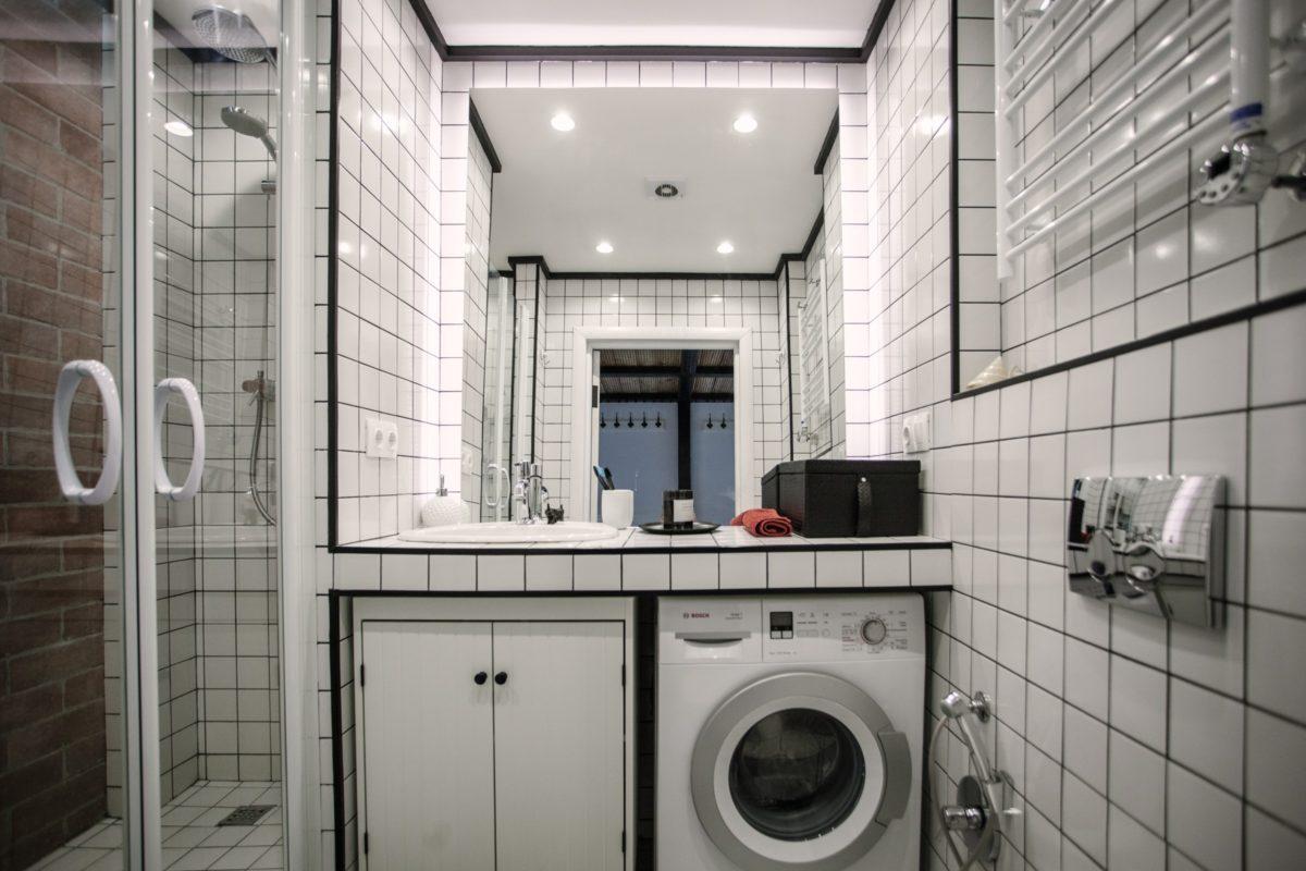 Правда, в данной ситуации придется отказаться от умывальника традиционных размеров в пользу компактной раковины. Если это сделать, в помещении можно будет спокойно установить стандартный умывальник и стиральную машинку.