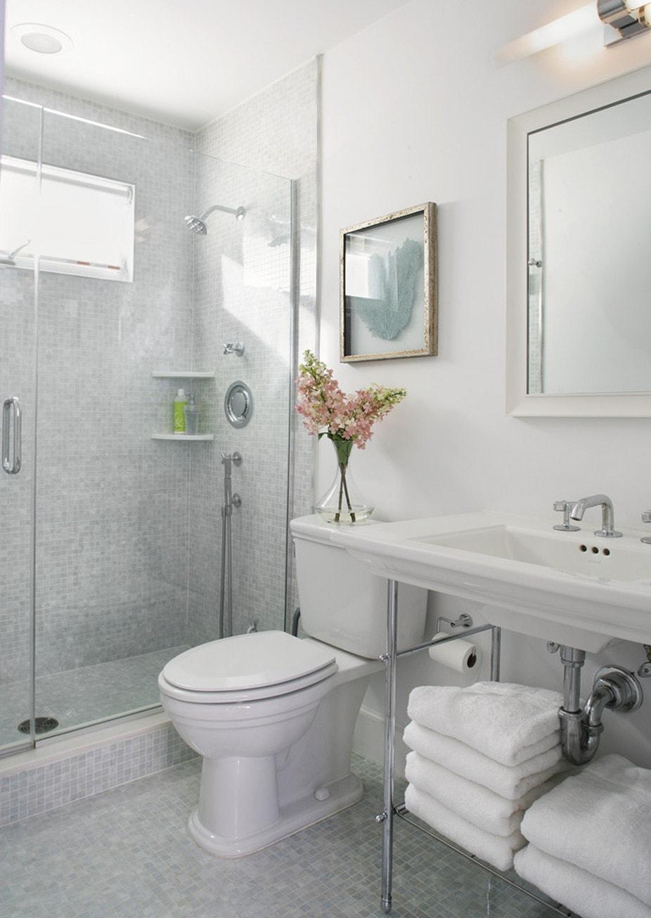 В душевой кабинке стекло должно быть прозрачным, а помещение не следует загромождать пузырьками, флакончиками, для которых следует выделить отдельное место. Их можно расположить в шкафу под раковиной. Желательно пользоваться философией минимализма, гласящей, что в небольшой комнате следует располагать маленькие вещи.