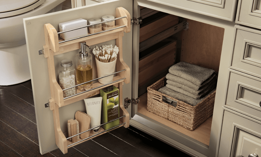 - Шкафы. Они должны быть оборудованы мелкими полками. На них смогут удобно помещаться флаконы, баночки и коробочки разных форм и размеров. Такая организация гарантирует, что под рукой всегда будут находиться все вещи первой необходимости.