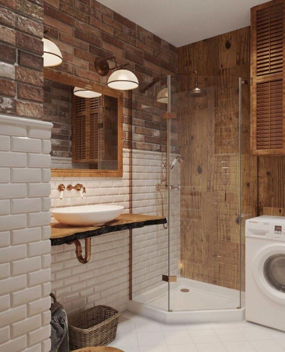 Ванная комната в индустриальном стиле содержит старинные предметы мебели, необычные осветительные приборы, «строительный» душ с оригинальной лейкой. Напольное покрытие имитирует бетон. Трубы, вентиляционный короб, нарочито грубая отделка стен (кирпичная кладка, штукатурка) дополняют общую картину.
