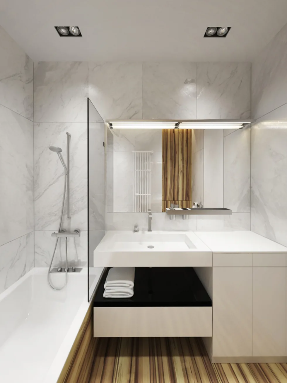 При выборе душевой кабины стоит остановить свой выбор на модели с дверцей из прозрачного стекла, отказавшись от матового или цветного. Более легким сделает восприятие дизайна и прозрачная раковина. Все мелочи вроде косметики или стопок полотенец лучше спрятать в шкафчики, чтобы лишний раз не загромождать пространство.