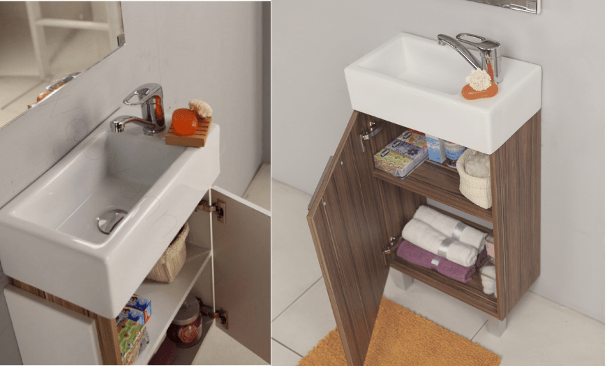 - Раковина. Пространство под ней представляет собой отличное место для хранения бытовой химии и средств для уборки. Также здесь можно установить стиральную машину. А для тех, кто хочет максимально сэкономить место, предназначены угловые раковины.