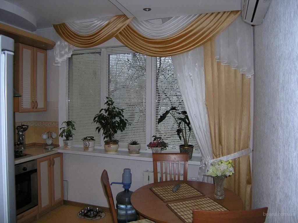 Честно говоря, в современных интерьерах такое оформление окна встретишь редко. Да и для кухни с балконной дверью не очень практичный вариант. Как любят говорить, «дорого, богато», но на деле часто получается совершенно безвкусно.