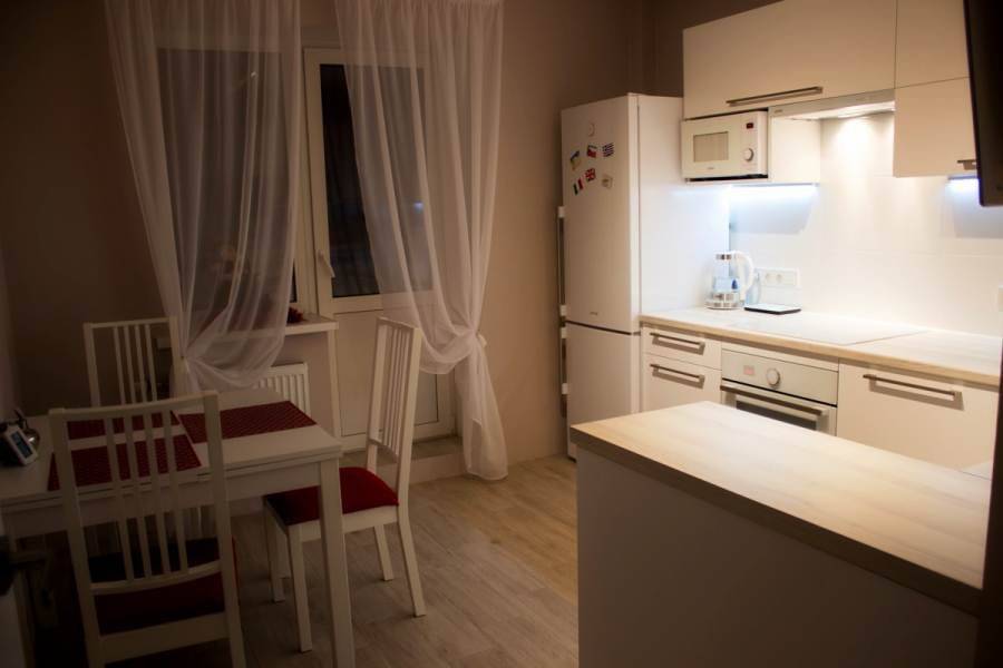 Классическое кухонное пространство имеет квадратную или прямоугольную форму. Из этого следует, что балконная дверь зачастую расположена напротив входа в кухню. Такая планировка считается приемлемой и позволит выбрать шторы для проема. В будущем они не станут мешать свободному перемещению по кухне.