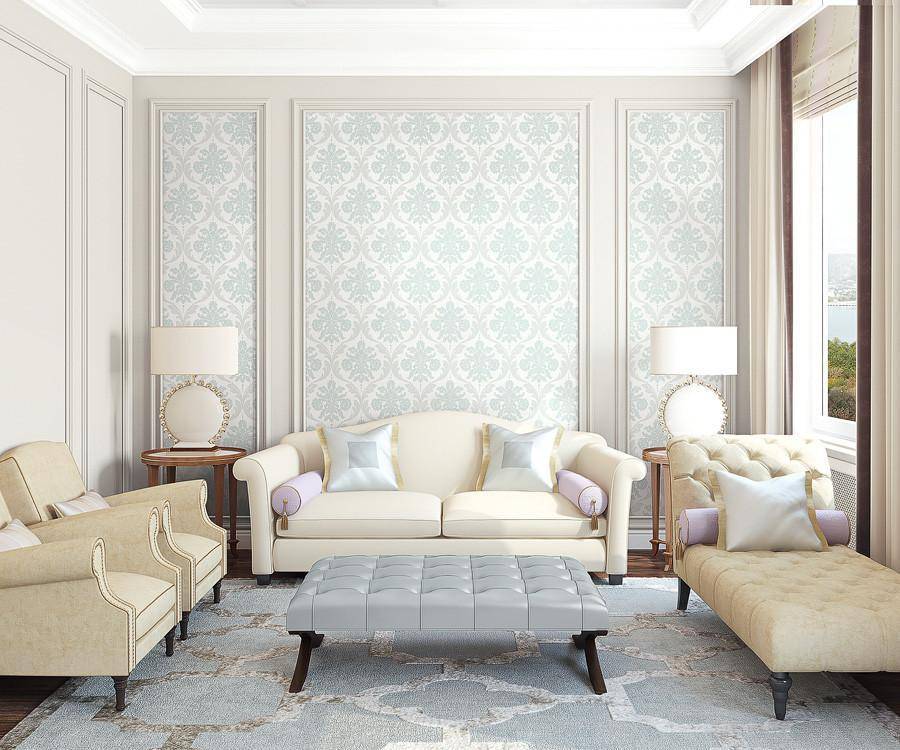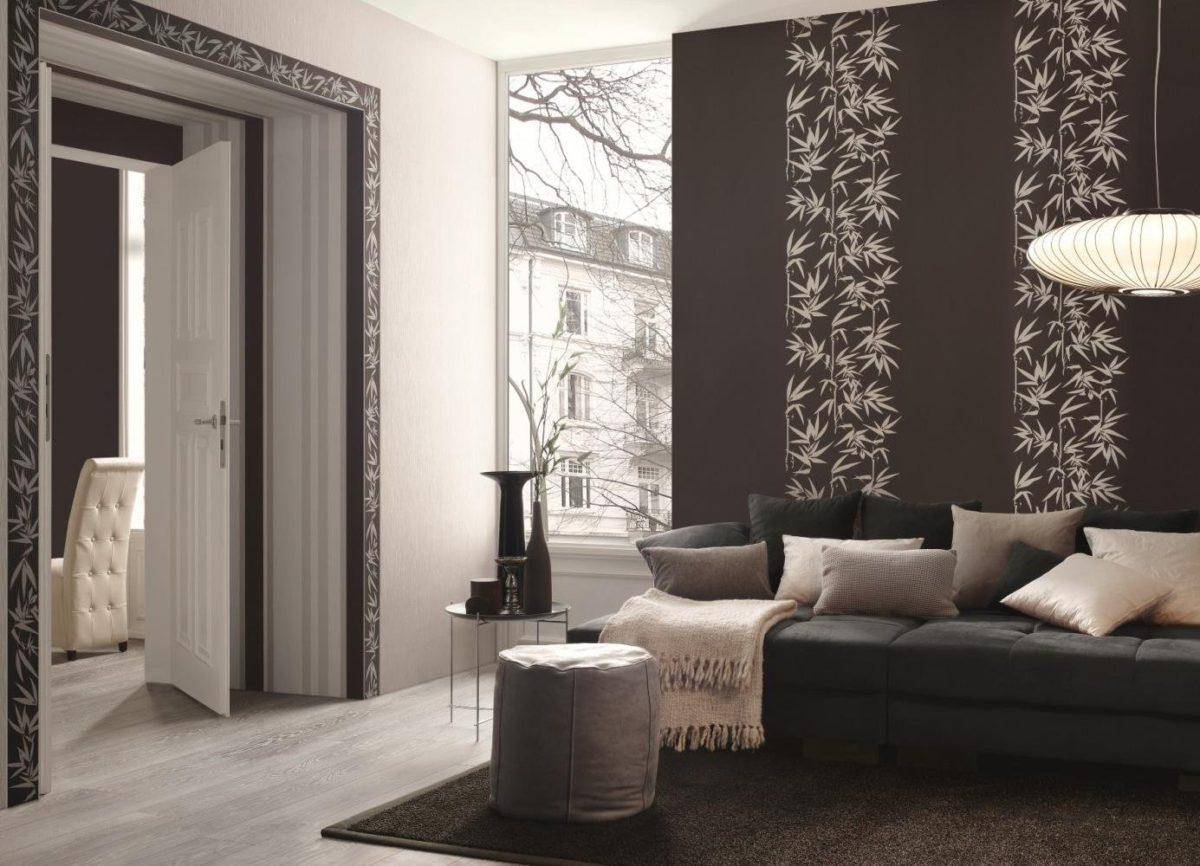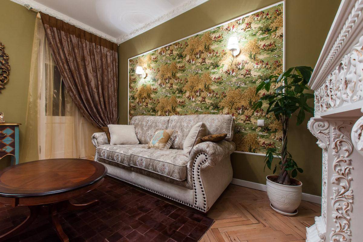 Украшением гостиной может стать участок стены, оклеенный обоями, отличающимися по цвету, узору или фактуре.