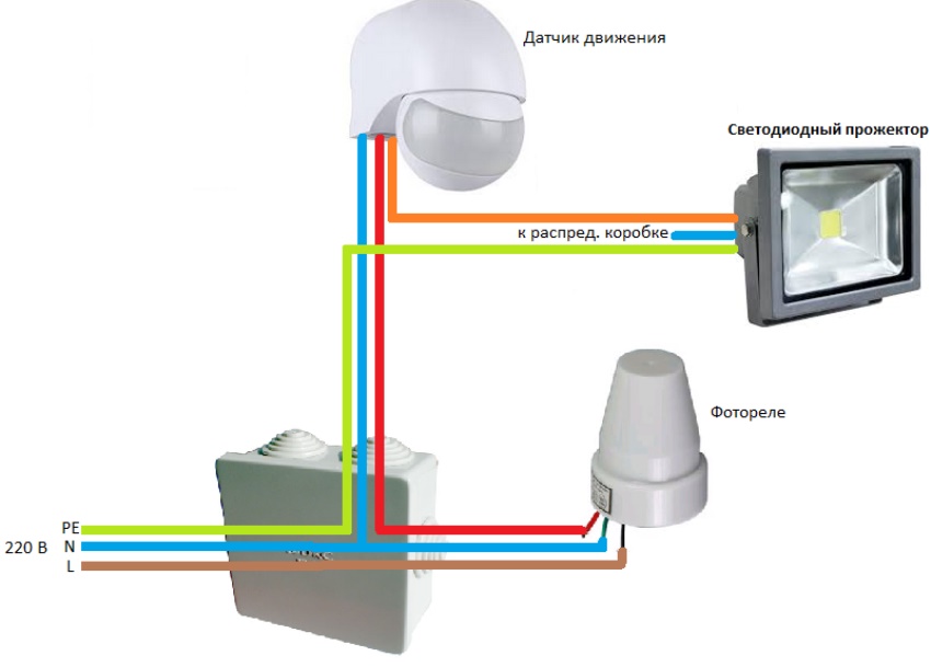 Фотореле от любого производителя имеет 3 провода для подключения — 1 всегда красного цвета, 2 других могут иметь разную окраску у разных производителей (обычно это синий/темно-зеленый и черный/коричневый). Красный идет на светильники или соединяется с датчиком движения. Синий или темно-зеленый подключаете на нулевой провод питающего кабеля и светильника, а к черному или коричневому подключается фаза. Если реле имеет нестандартные цвета проводов, следует прочитать в инструкции, какой провод куда нужно подсоединять.