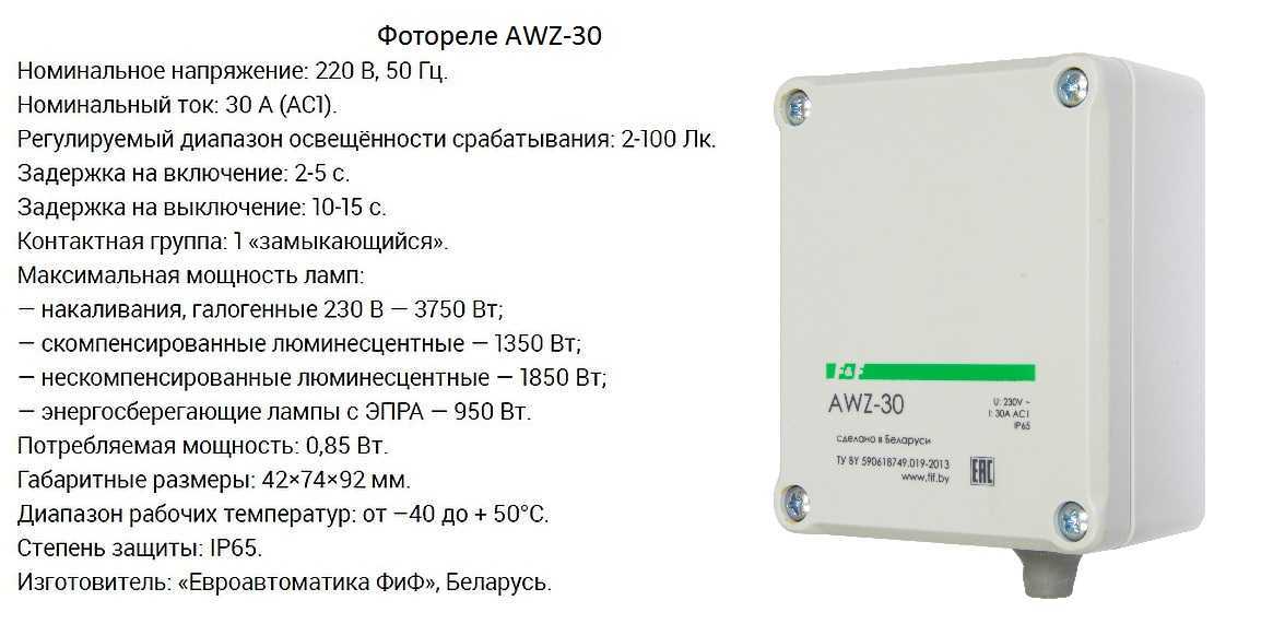 Обратите внимание на пределы регулировки чувствительности. Они могут быть больше или меньше. Например, у фотореле AWZ-30 белорусского производства этот параметр — 2-100 Лк, у фотоэлемента P02 диапазон подстройки 10-100 Лк