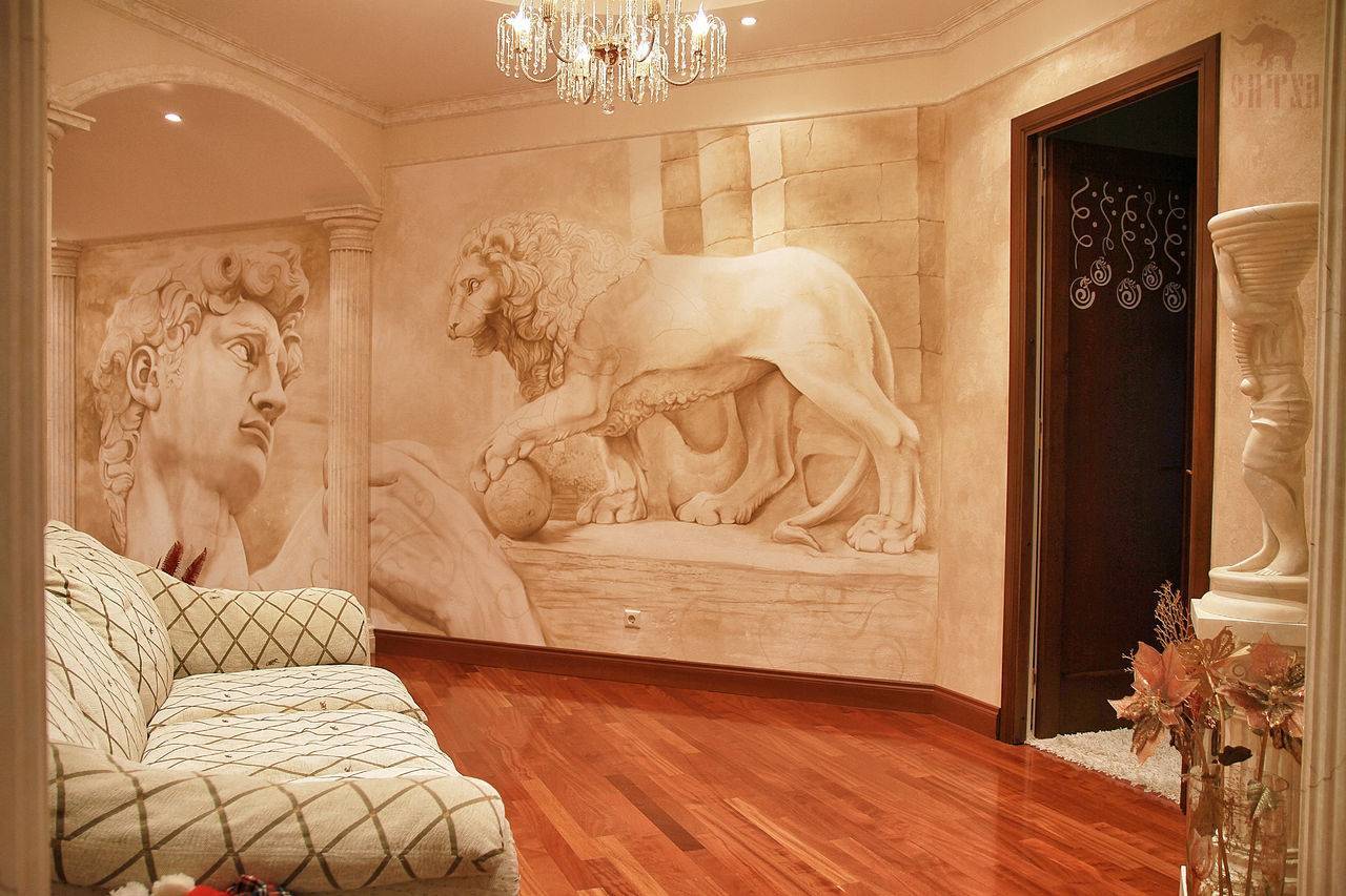 - зонирование. Фреской можно украсить только часть стены, отделяя одну зону от другой. Допустим, стены в совмещенной кухне-гостиной оштукатурены. Одну из стен в гостиной можно украсить фреской. И тогда уж точно никаких стен не понадобится, чтобы провести черту между разными зонами;