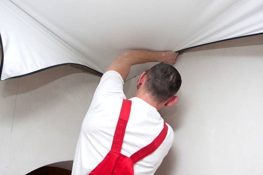 После того как полотно было поднято на потолок, его растягивают и греют тепловой пушкой. Как только ПВХ приобрел необходимую пластичность, край заводят в паз багета и проталкивают до упора специальным шпателем. Сначала на углах, затем в середине, последовательно увеличивая ширину закрепленного полотна.