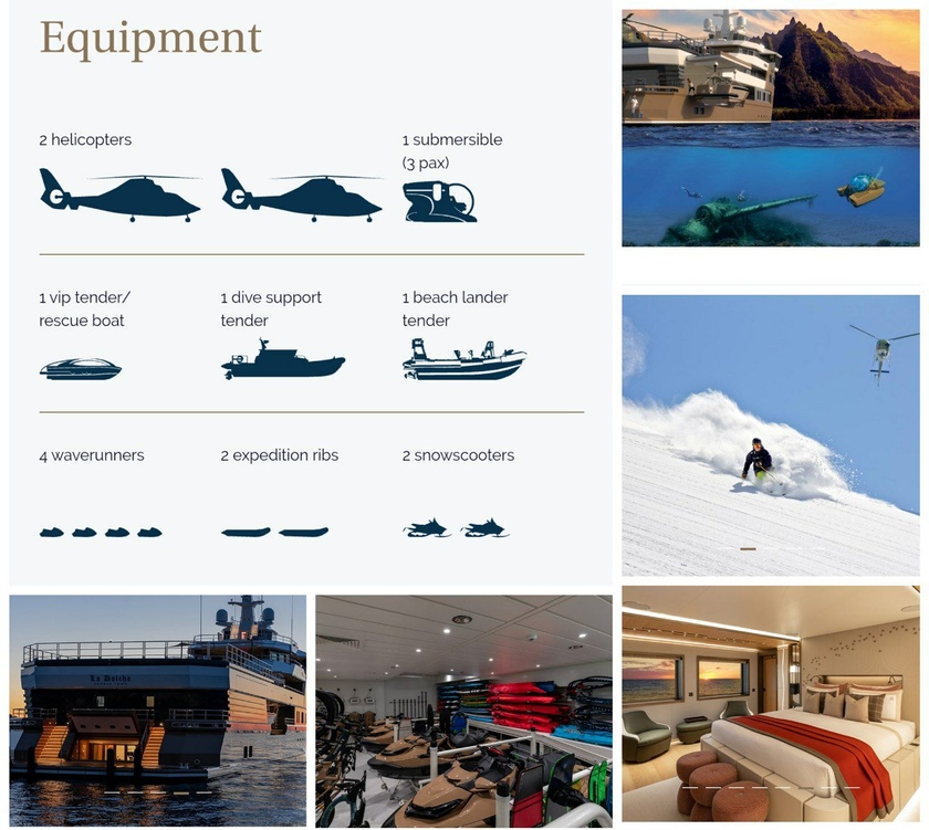 77-метровое судно La Datcha по заказу российского предпринимателя разработала компания Damen Yachting. Яхта ледового класса SeaExplorer способна проводить в открытом море до 40 дней без возвращения в порт за счет улучшенных топливных баков и системы сбора мусора, отмечает издание. На ней есть батискаф, две площадки для вертолетов и снегоходы.
