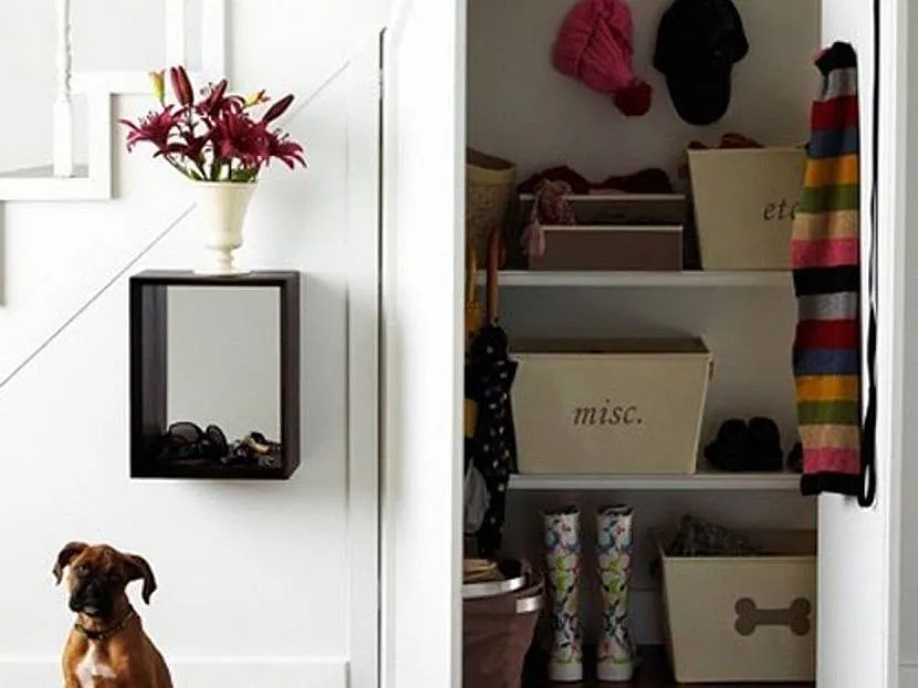 Если лестница находится в коридоре, то зону под пролетом обустраивают под удобную прихожую. В самой высокой точке пространства ставят узкий купе для верхней одежды, в низкой – комод или пару тумбочек для обуви и аксессуаров. В компактном участке дизайнеры рекомендуют использовать небольшой пенал и открытые полки. Вместительность и декоративность стеллажей помогут улучшить секционные боксы.
