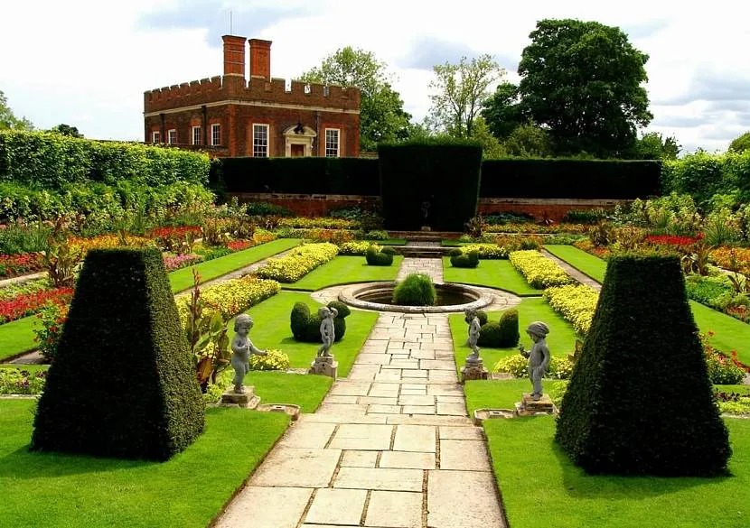 - Строгая симметрия. Это прослеживается в декоративной растительности: аккуратно и одинаково подстриженные кустарники, одной высоты цветы, ровные формы цветников и альпинариев.