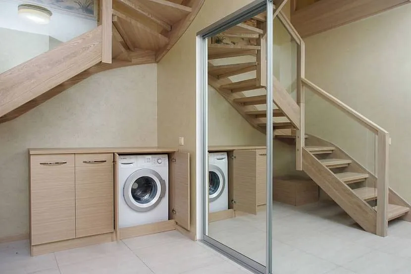 Область под лестницей переоборудуют под компактную постирочную. Оптимальные размеры – 2 квадрата. Горизонтальную стиральную и сушильную машины можно установить как в один ряд, так и в виде колонны. Если высота позволяет, то для сушки вещей и промокшей одежды используют специальный электроприбор-шкаф.