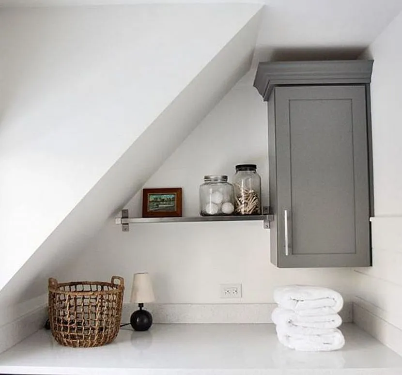В прачечной располагают встроенную или переносную гладильную доску. В пространстве под лестницей можно установить паровую систему для глажки или традиционный утюг. В зоне ставят корзины для сортировки белья, монтируют полки для бытовой химии и сушильную конструкцию.