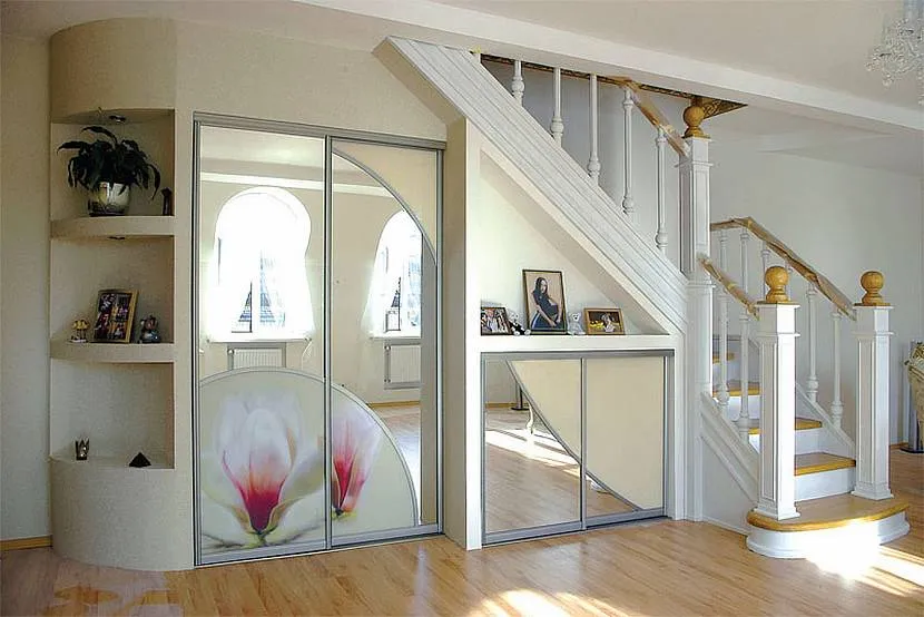 Если лестничный пролет находится рядом со спальней, то пространство используют для личных вещей и постельного белья. В зависимости от размеров, в зоне можно установить купе, комод или тумбу. При украшении фасадов зеркалами визуально увеличивается помещение и улучшается освещение.