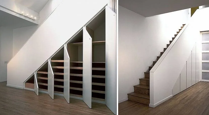 Участок под лестницей используют для содержания вещей и предметов. Удобство и практичность зоны зависит от размеров области и назначения. Встроенная система с выдвижными полками и штангами станет вместительным гардеробом. В шкафу можно хранить одежду и обувь до следующего сезона.