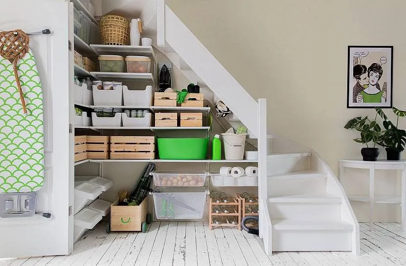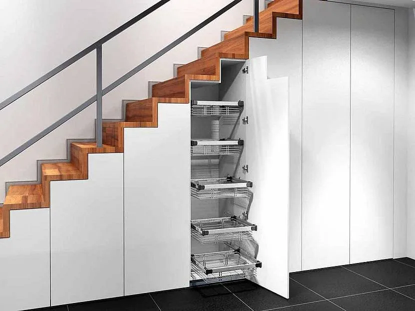 Пространство под лестницей переоборудуют под удобную кладовую. В зоне хранят бытовые мелочи (лампочки, салфетки) или повседневные домашние предметы. Очень удобны выдвижные ящики и полки, которые не занимают много места. Если участок расположен рядом с кухней, то на стеллажах можно держать:
