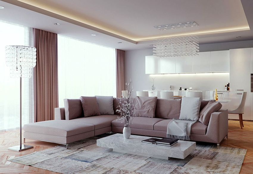 Необычный интерьер может быть создан и при зонировании пространства на определенные участки, причем применяются карнизы в любом помещении;