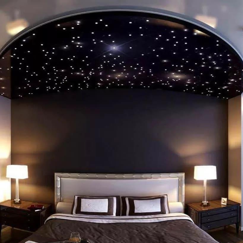 - Воссоздать звёздное небо можно и на обычном гипсокартонном потолке. Это займёт больше времени, но зато будет дешевле, а эффект превзойдет все ожидания. Монтаж несложный, но трудоёмкий. Нужно просверлить в гипсокартоне отверстия диаметром до 2-х мм (примерно 80 шт/м2 ) и продеть в них оптические волокна. После чего закрепить их клеем. Для максимального достижения эффекта звёздного неба в одно отверстие можно продевать несколько нитей или оставлять их на разной высоте от поверхности потолка. Усилить впечатление можно, нанеся флуоресцентной краской на потолок какой-либо узор.