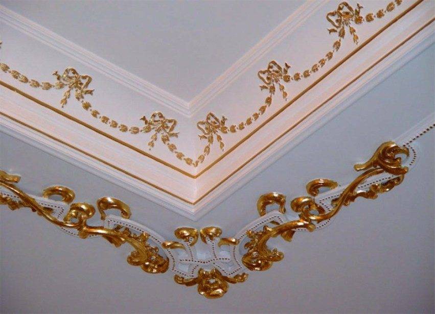 Орнаменты. Декоративные планки, способные хорошо подчеркнуть и дополнить потолок с лепниной в квартире. Иногда перекликаются с растительным орнаментом карниза или розетки, или же обладают оригинальным оформлением. Детали орнамента удачно выделяют отдельные зоны на потолке: с их помощью можно создать сложный ансамбль.