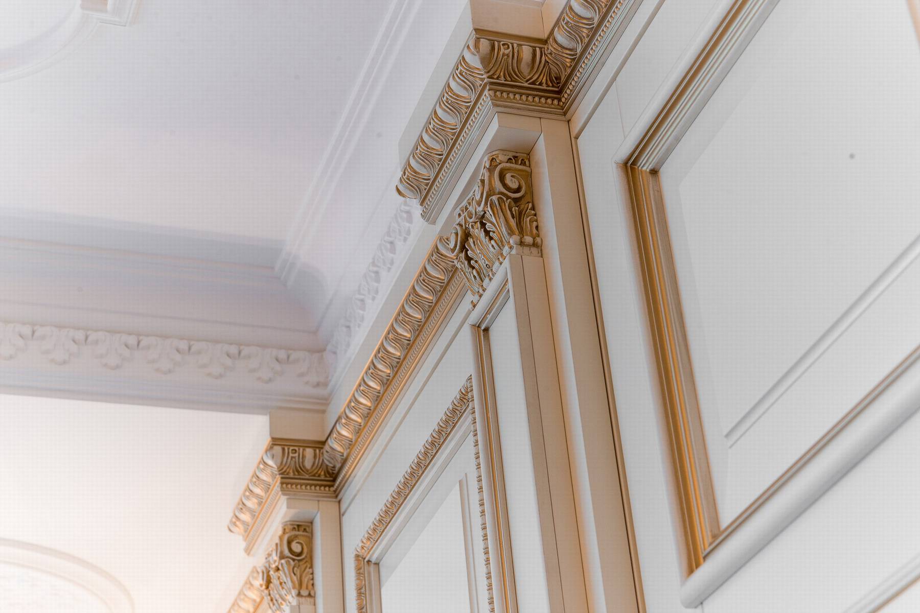 - Потолочные лепные детали с гладким профилем. Наши дизайнеры всегда ориентируются на стиль помещения, а карнизы такого типа хорошо подходят и для строгих интерьеров. Их будет уместно разместить в любых помещениях, например банкетном зале, холле или библиотеке.