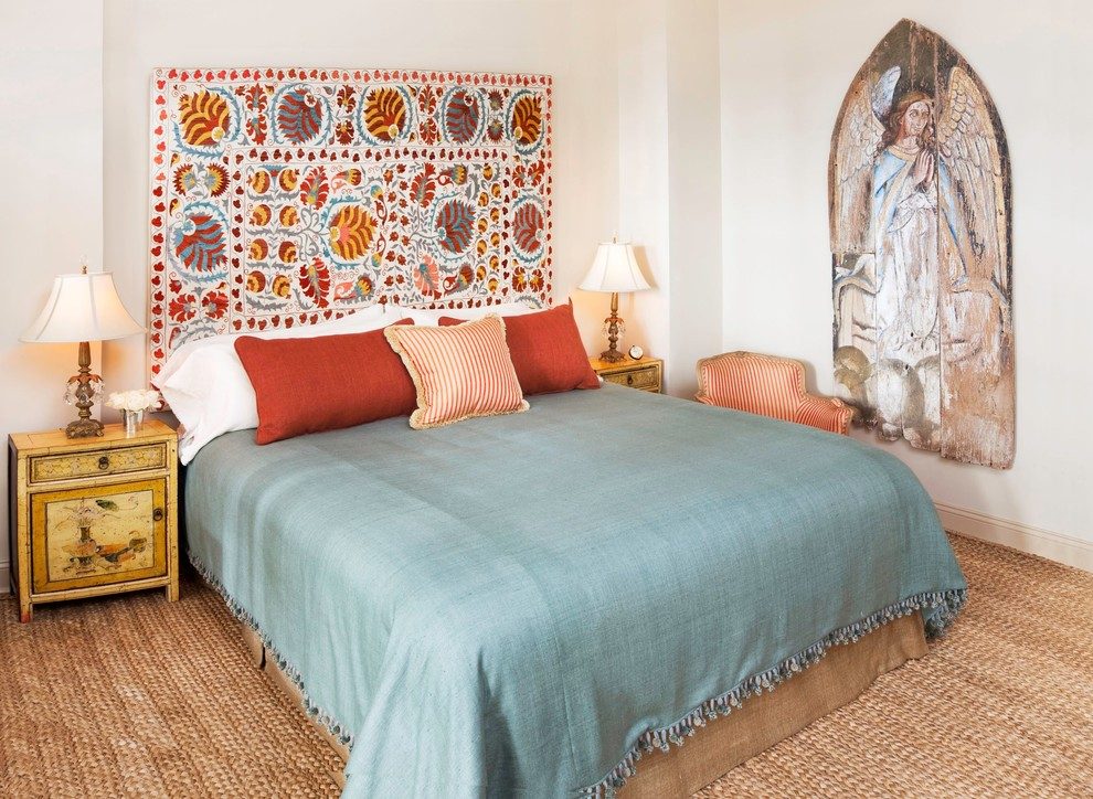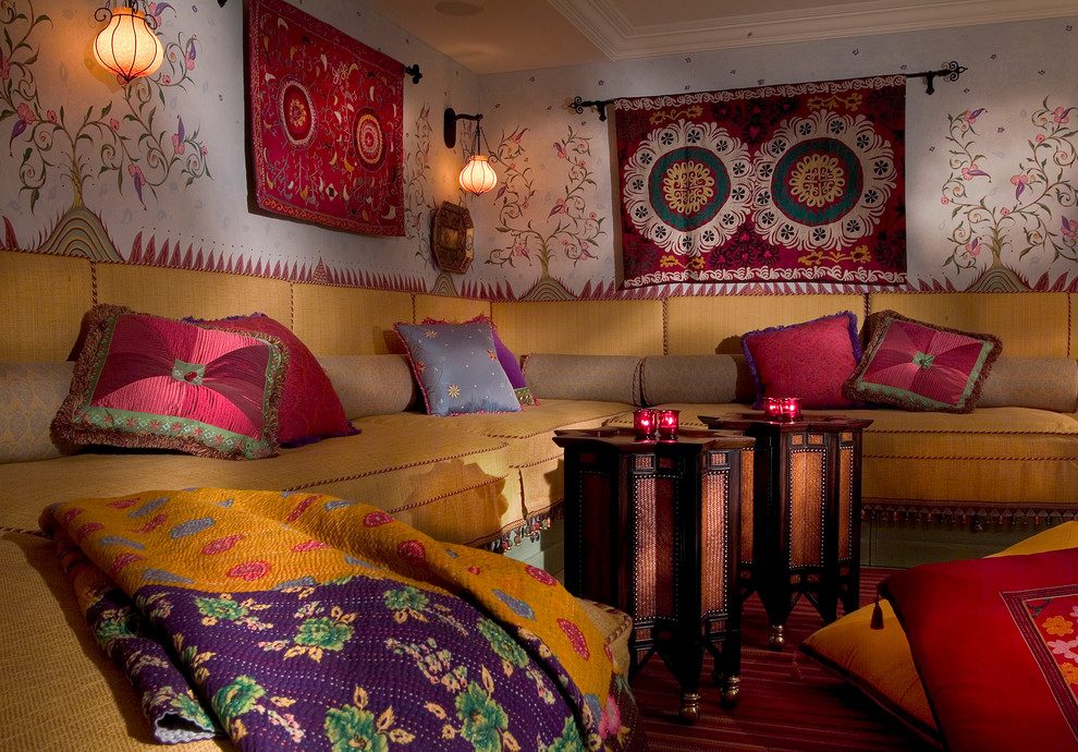 Восток. Визитной карточкой любого восточного интерьера считается именно мягкий тканый ковер, он используется везде — на полу, на стенах, как покрывало, даже как фактура на диванных подушках. Если в вашем доме присутствуют восточные ноты — обилие думок, кальяны, кувшины или вазы с острыми горлышками, балдахины, большое количество текстиля и пр., гобелен идеально впишется в общую картину. К тому же, яркие восточные узоры сейчас в тренде, в конце концов, если кто-то принципиально против ковров, это может быть тематическая вышивка на дивандеках.