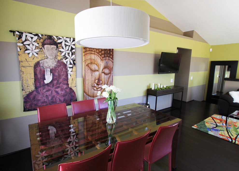 Большое панно во всю стену создаст акцент и потребует более тщательного выбора аксессуаров. Если же для декорирования выбраны несколько спокойных небольших полотен, можно не опасаться, что такое изобилие «перегрузит» гостиную.