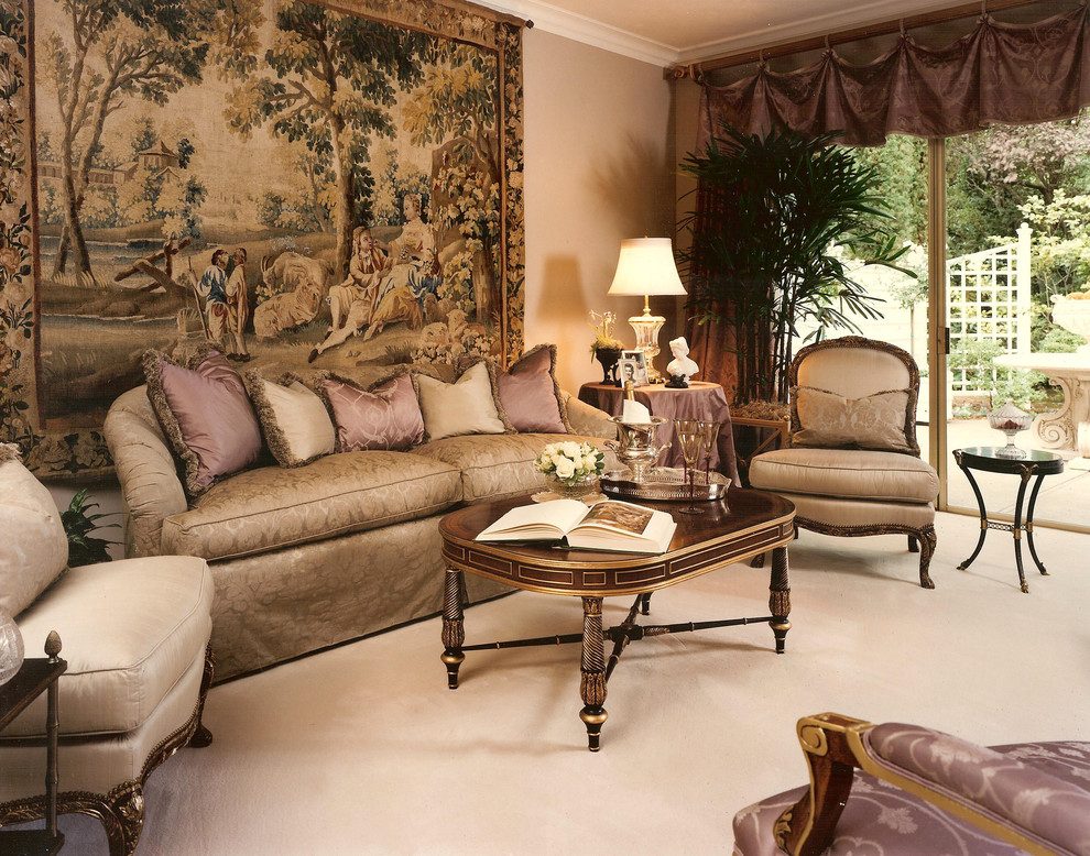 Классика. Применение гобелена в классическом интерьере перекликается с оформлениями спален замков, где основное место коврам с рисунками или огромным картинам было отведено в изголовье большой кровати. Многие хозяева современных квартир, вдохновленные дворцовыми убранствами и полюбившие роскошь, и вовсе натягивают на полную стену в спальне ткань с изображением известного сюжета вместо обоев.