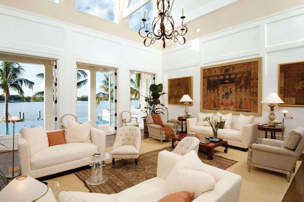 Элегантность и естественность интерьера гостиной с изображениями пейзажей, моря, солнца, растений