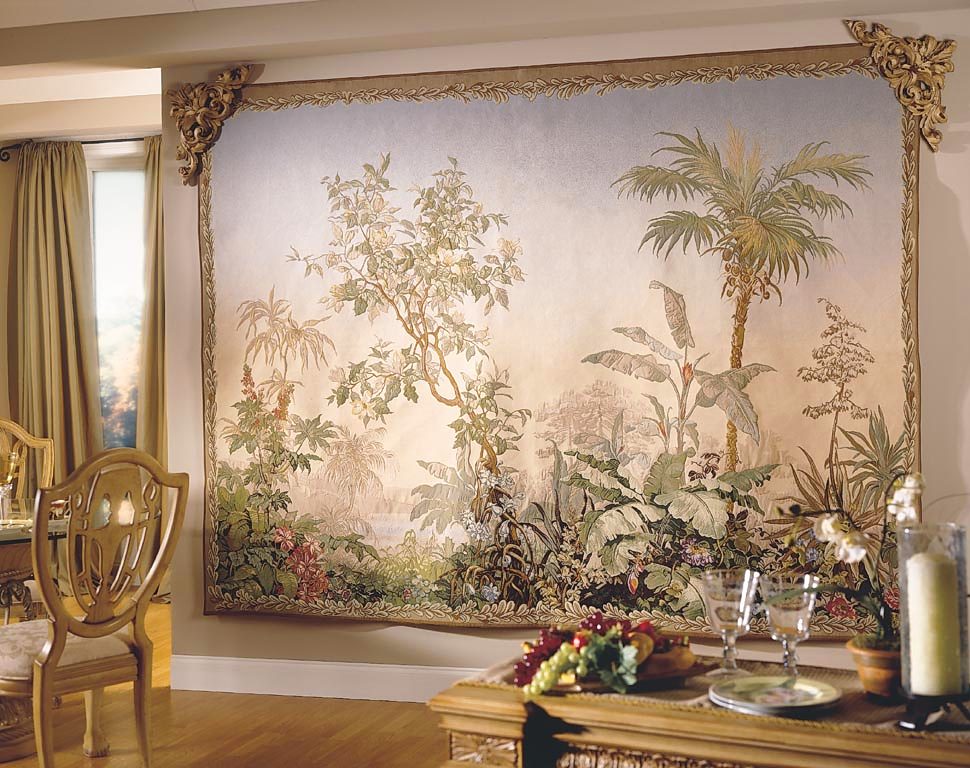 Панно из гобелена в интерьере – отличный вариант украсить стену в жилище. Интересный декор привнесёт новизну и индивидуальность в интерьер любой квартиры и не только. Все гобеленовые панно содержат специальную подкладку, в ней имеется отверстие, сквозь которое вставляется карниз, посредством карниза гобелен подвешивается на стену. Такое отверстие, называемое карманом, обычно располагается сверху панно. Есть гобелены, которые снабжены карманом снизу для того, чтобы утяжелить картину во избежание возникновения сборок и искривления углов. Благодаря наличию двух карманов расположить панно на стене проще и быстрее.