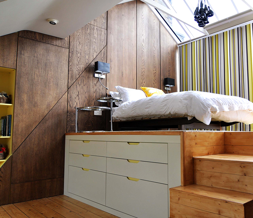 В помещении с невысокими потолками дизайнеры придумали схожий способ: днем кровать можно поднимать к потолку, а вечером – опускать вниз специальным автоматическим механизмом. На месте кровати днем оформляется рабочая зона. Недостаток такого варианта зонирования – высокая стоимость.